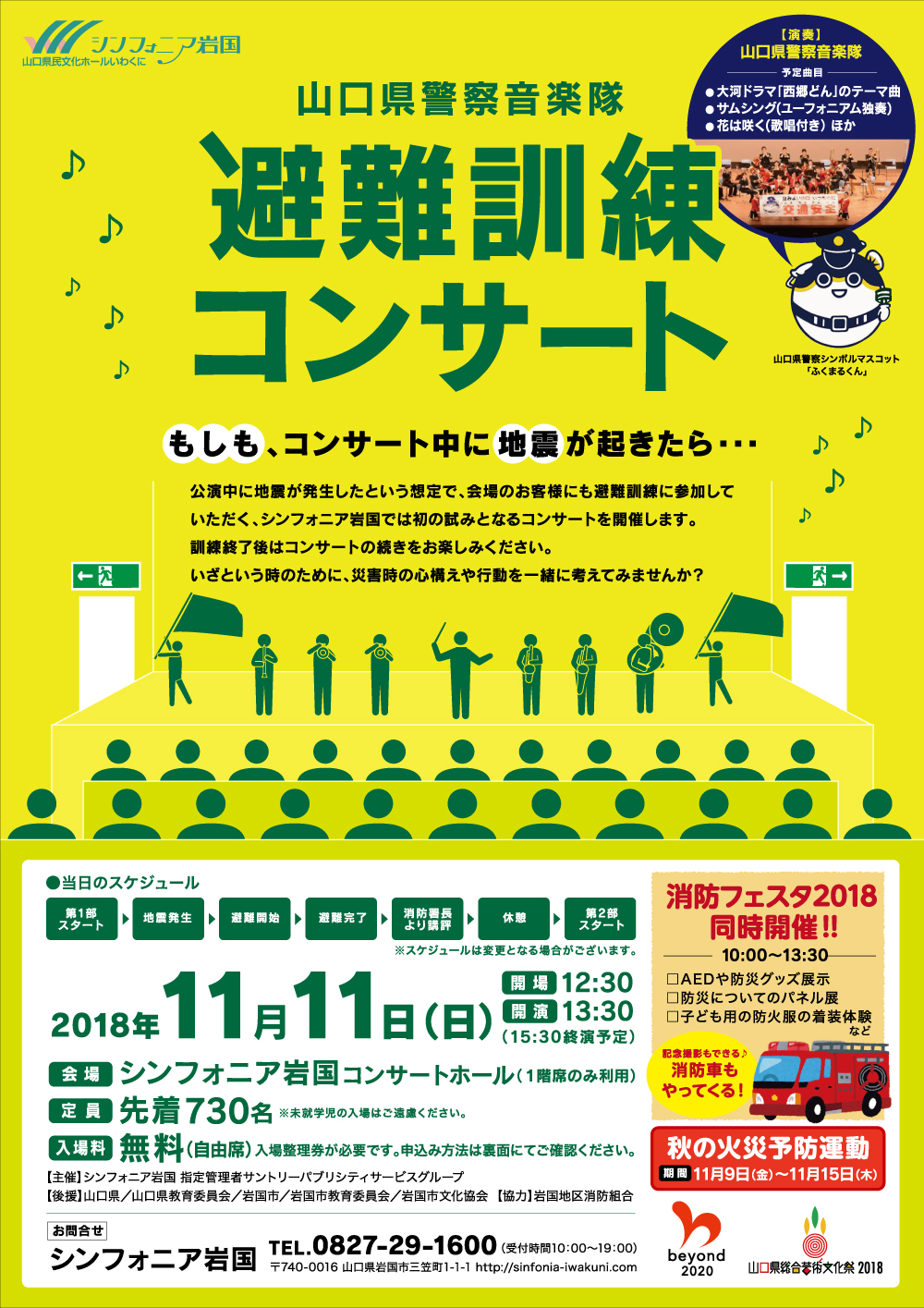 | 主催・後援等 | 【主催】シンフォニア岩国 指定管理者サントリーパブリシティサービスグループ 【後援】山口県/山口県教育委員会/岩国市/岩国市教育委員会/岩国市文化協会 【協力】岩国地区消防組合 |