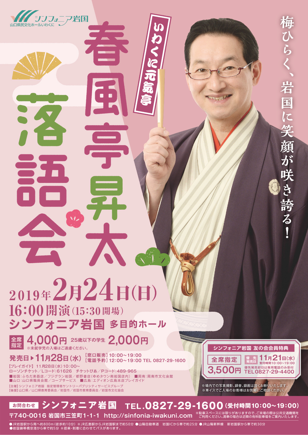 | シンフォニア岩国友の会特典 | 会員価格 全席指定:3,500円/学生2,000円(25歳以下の学生) ※未就学児入場不可 優先発売日 11月21日(水)(10:00~19:00) 優先発売初日は電話予約のみ受付 TEL0827-29-4400 |