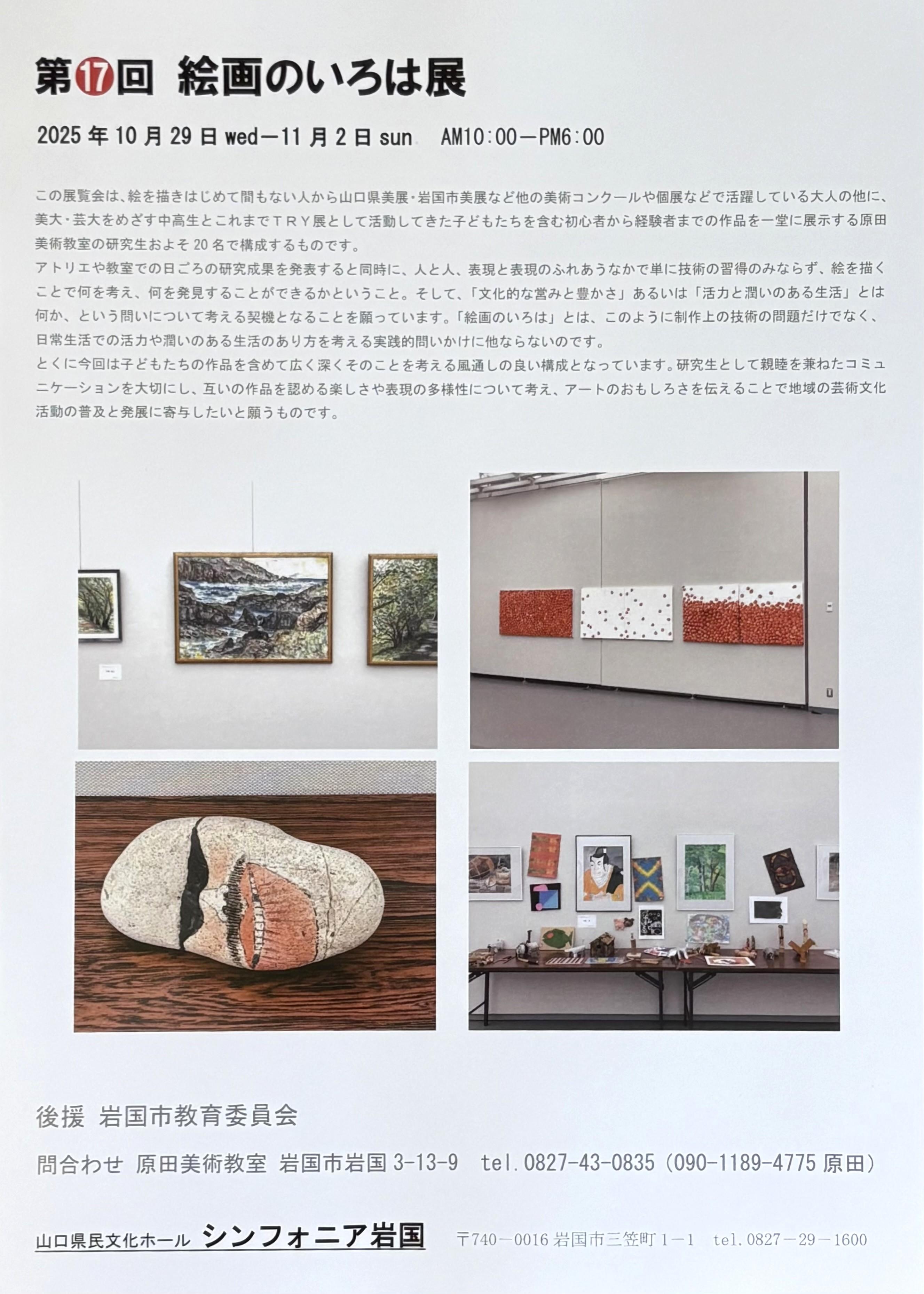 この展覧会は、絵を描きはじめて間もない人から山口県美展・岩国市美展など他の美術コンクールや個展などで活躍している大人に加えて、これまでTRY展として活動してきた子どもたちを含む初心者から経験者までの作品を一堂に展示する原田美術教室の研究生およそ20名で構成するものです。