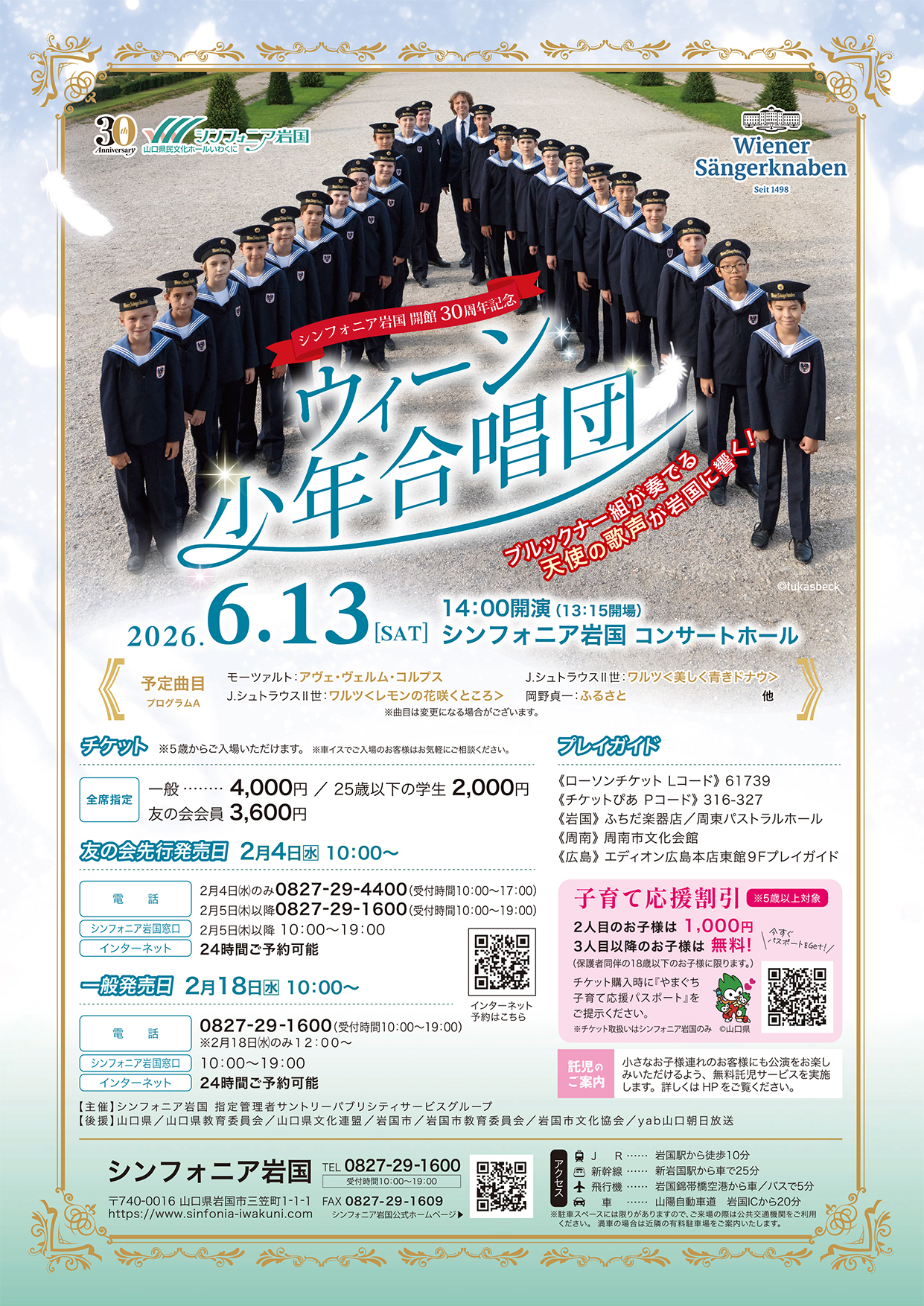 | 主催 | 【主催】シンフォニア岩国 指定管理者サントリーパブリシティサービスグループ 【後援】山口県/山口県教育委員会/山口県文化連盟/岩国市/岩国市教育委員会/岩国市文化協会/yab山口朝日放送 |