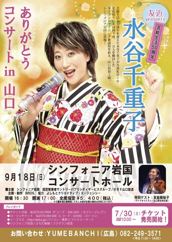 | 主催等 | 主催:グッドラックプロモーション 共催:シンフォニア岩国 指定管理者サントリーパブリシティサービスグループ 企画:株式会社長良プロダクション 制作:株式会社エイ・アンド・エイ 制作協力:株式会社長良ファミリークラブ 後援:日本コロムビア株式会社 |