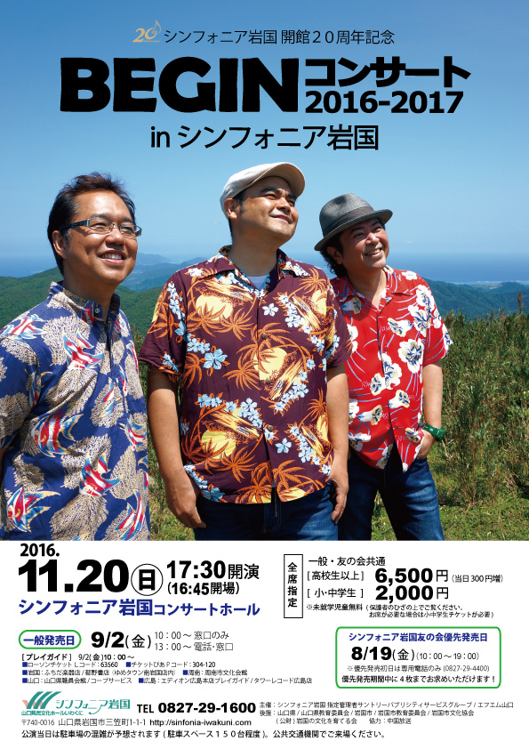 | 主催等 | 【主催】シンフォニア岩国 指定管理者サントリーパブリシティサービスグループ/エフエム山口 【後援】山口県/山口県教育委員会/岩国市/岩国市教育委員会/岩国市文化協会/(公財)岩国の文化を育てる会/中国放送 |