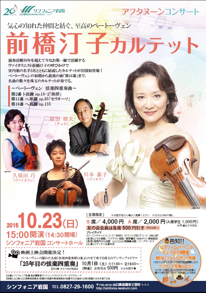 | 主催等 | 主催:シンフォニア岩国 指定管理者サントリーパブリシティサービスグループ/KRY山口放送 後援:山口県/山口県教育委員会/岩国市/岩国市教育委員会/岩国市文化協会/(公財)岩国の文化を育てる会 |