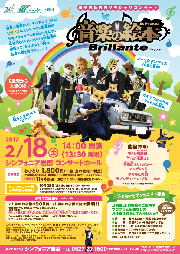 | 主催・後援等 | 【主催】シンフォニア岩国 指定管理者サントリーパブリシティサービスグループ/yab山口朝日放送/エフエム山口 【後援】山口県/山口県教育委員会/岩国市/岩国市教育委員会/岩国市文化協会/(公財)岩国の文化を育てる会/広島ホームテレビ 【助成】文化庁「平成28年度劇場・音楽堂等活性化事業」 |