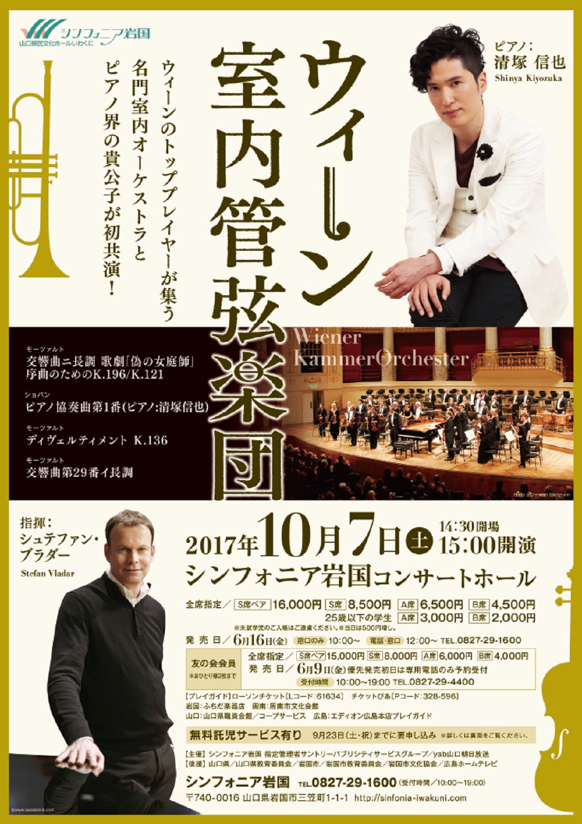 | 主催・後援等 | 【主催】シンフォニア岩国 指定管理者サントリーパブリシティサービスグループ/yab山口朝日放送 【協賛】キユーピー株式会社 【後援】山口県/山口県教育委員会/岩国市/岩国市教育委員会/岩国文化協会/オーストリア大使館/ウィーン市観光局/広島ホームテレビ 【協賛事業】山口県総合芸術文化祭2017 |