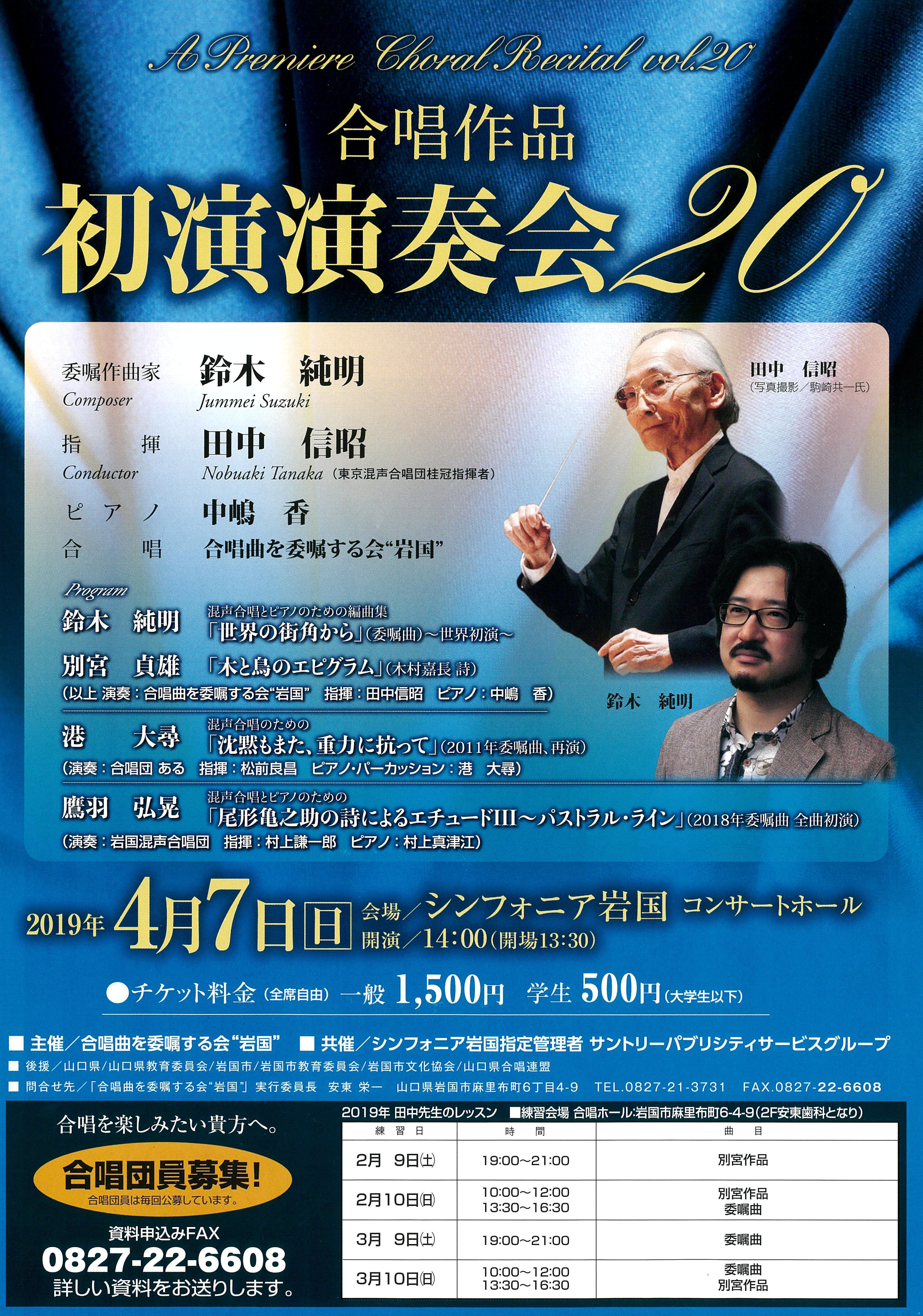 | 出演者 | 委嘱作曲家/鈴木 純明 指揮/田中 信昭 ピアノ/中嶋 香 合唱/合唱曲を委嘱する会"岩国" |