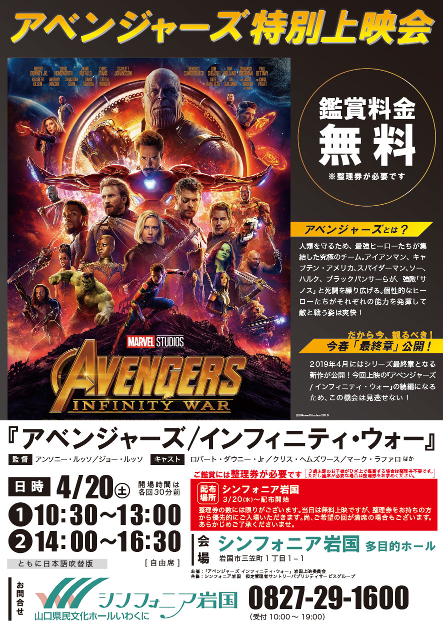 | 主催・後援等 | 【共催】シンフォニア岩国 指定管理者サントリーパブリシティサービスグループ 【主催】「アベンジャーズ/インフィニティ・ウォー」岩国上映委員会 |
