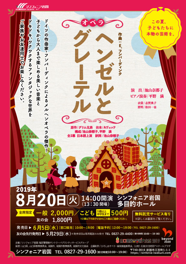 | 主催・後援等 | 【企画制作】ひろしまオペラ・音楽推進委員会/(公財)広島市文化財団アステールプラザ 【主催】シンフォニア岩国 指定管理者パブリシティサービスグループ 【後援】山口県/山口県教育委員会/岩国市/岩国市教育委員会/岩国市文化協会 |