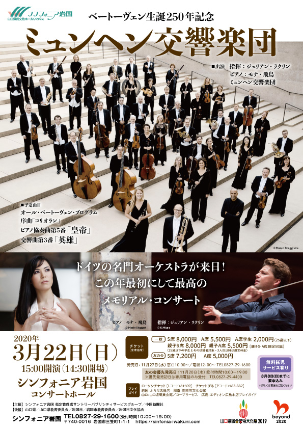 | 主催・後援等 | 【主催】シンフォニア岩国 指定管理者パブリシティサービスグループ/yab山口朝日放送/エフエム山口 【後援】山口県/山口県教育委員会/岩国市/岩国市教育委員会/岩国市文化協会 |