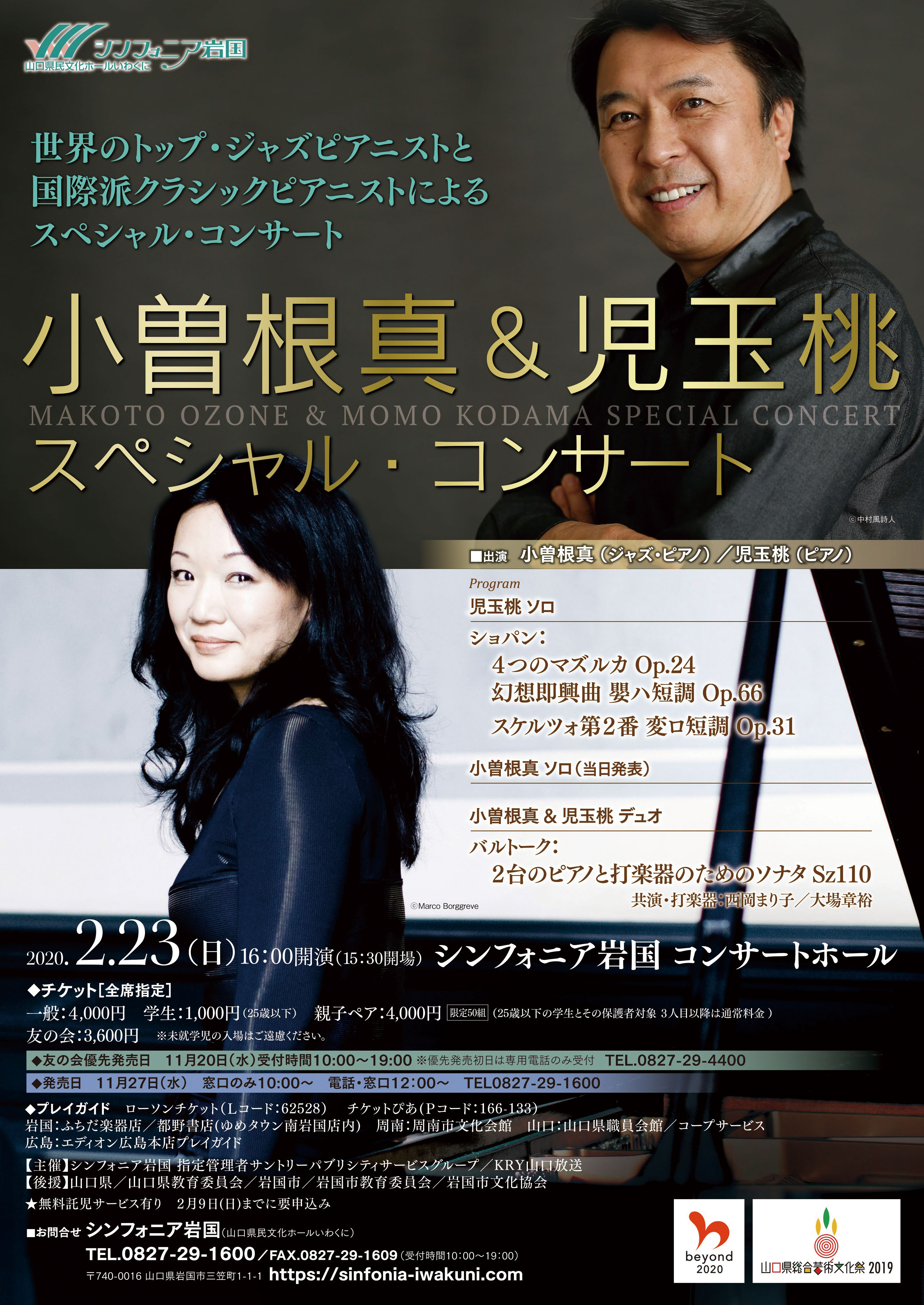 | 主催等 | 【主催】シンフォニア岩国 指定管理者サントリーパブリシティサービスグループ 【後援】山口県/山口県教育委員会/岩国市/岩国市教育委員会/岩国文化協会 【協力】ロータス プロモーションズ |
