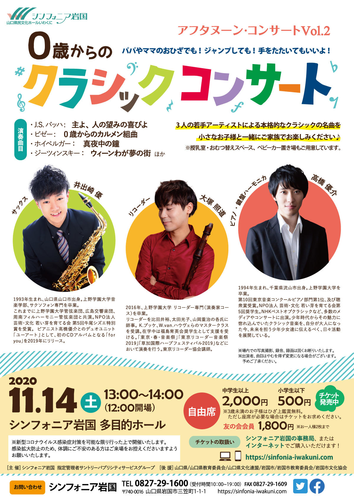 | 主催等 | 【主催】シンフォニア岩国 指定管理者サントリーパブリシティサービスグループ/ 【後援】山口県/山口県教育委員会/山口県文化連盟/岩国市/岩国市教育委員会/岩国文化協会 【助成】公益財団法人 日本室内楽振興財団 |