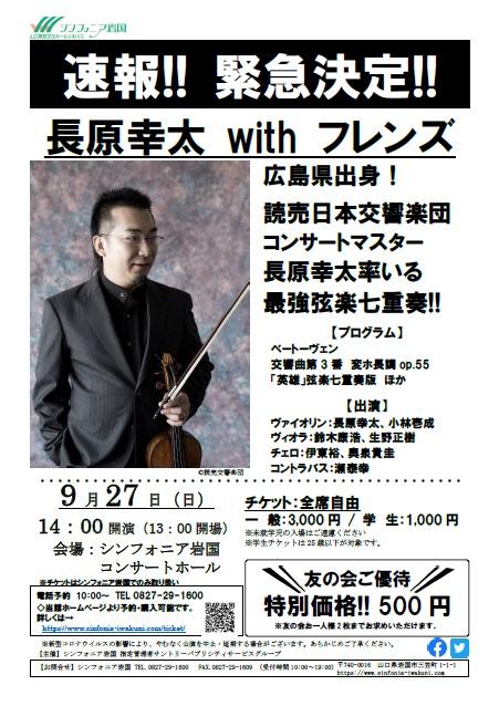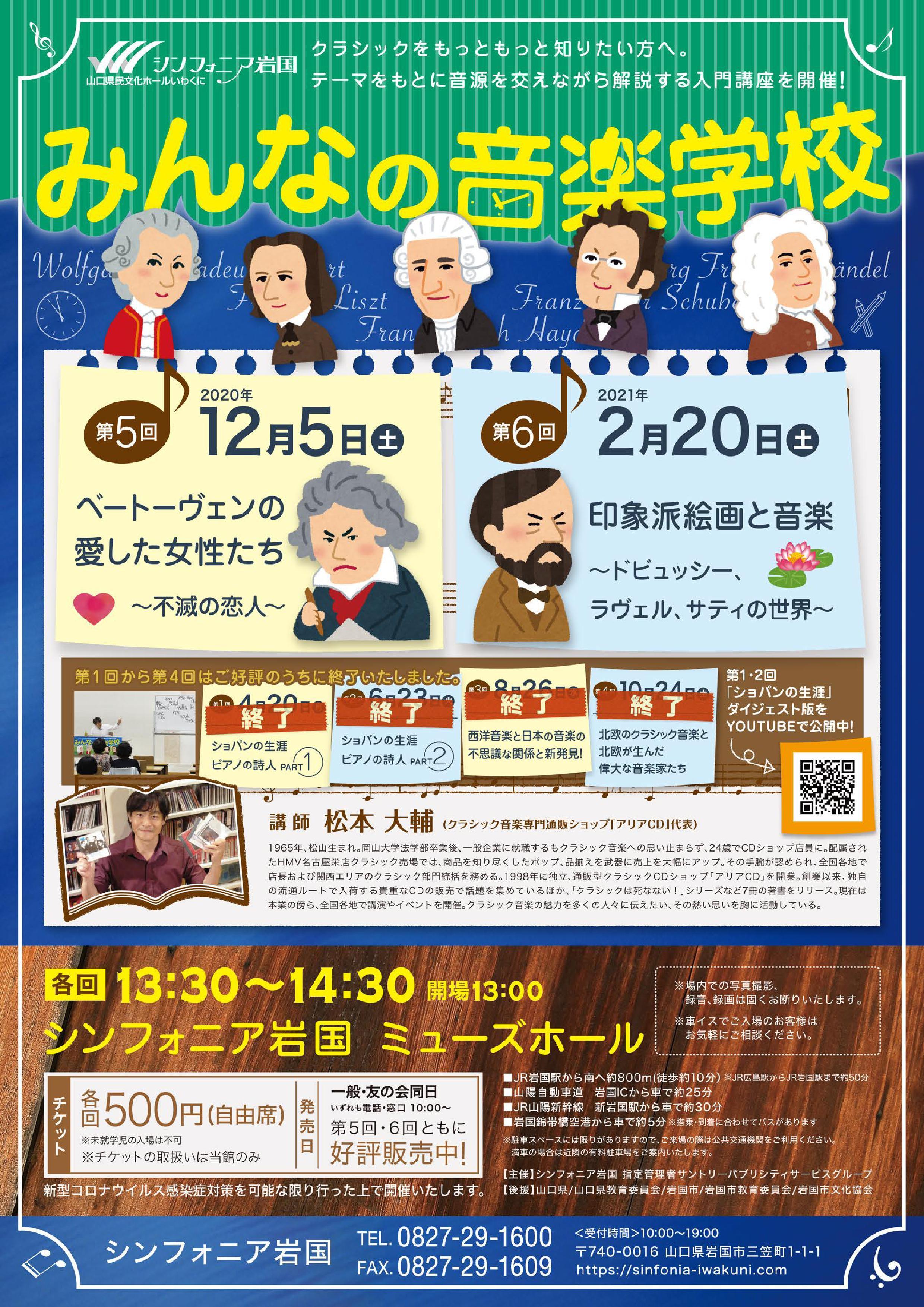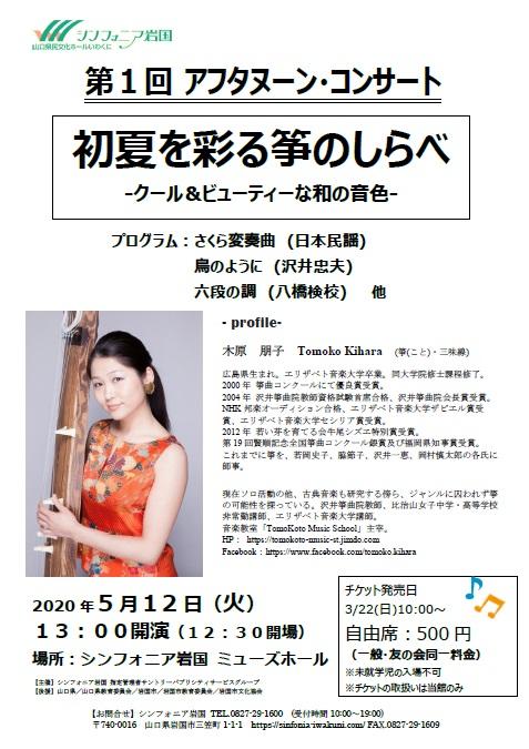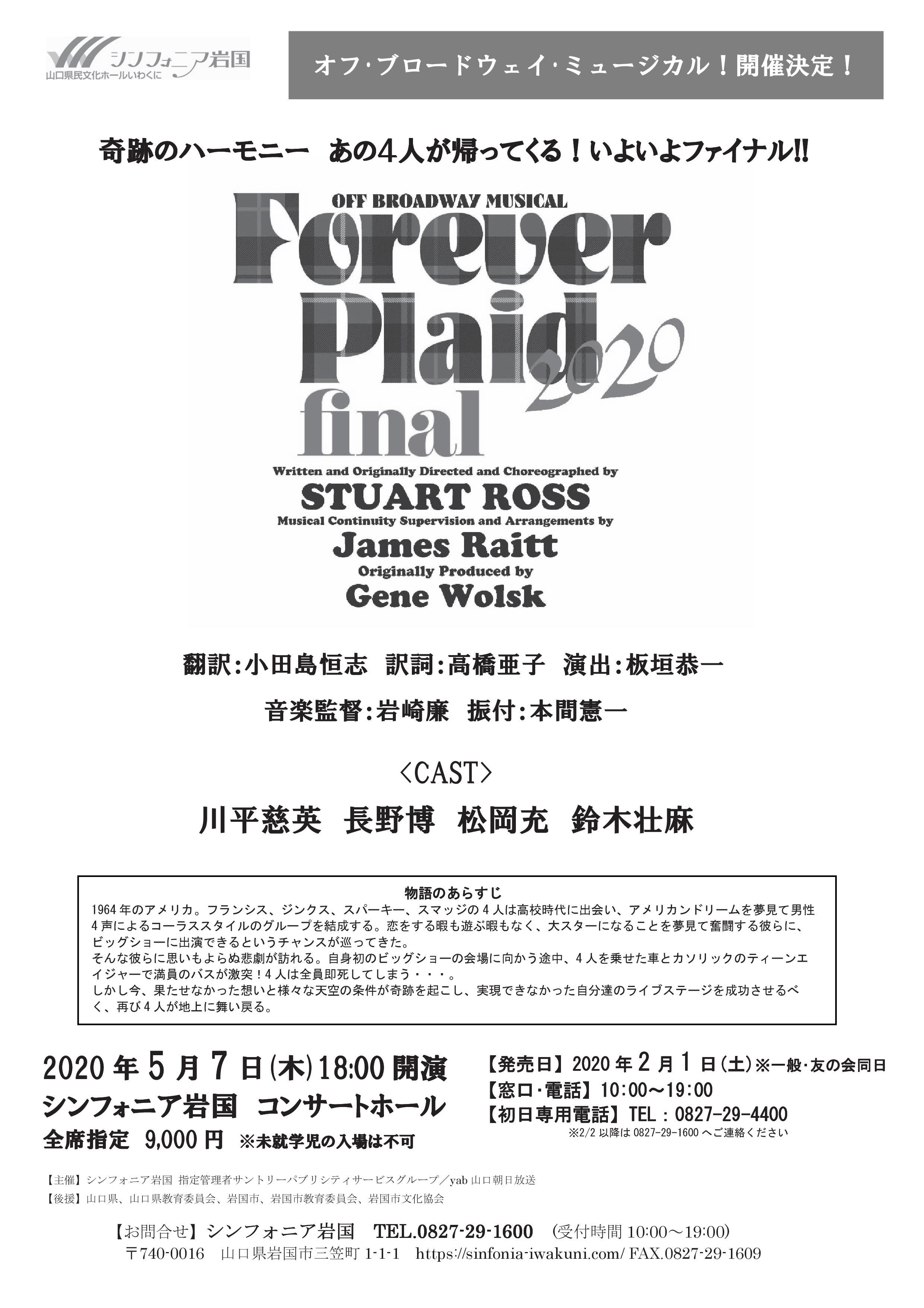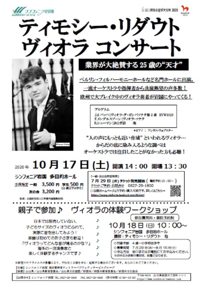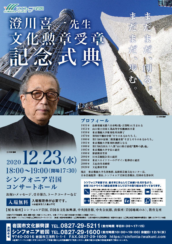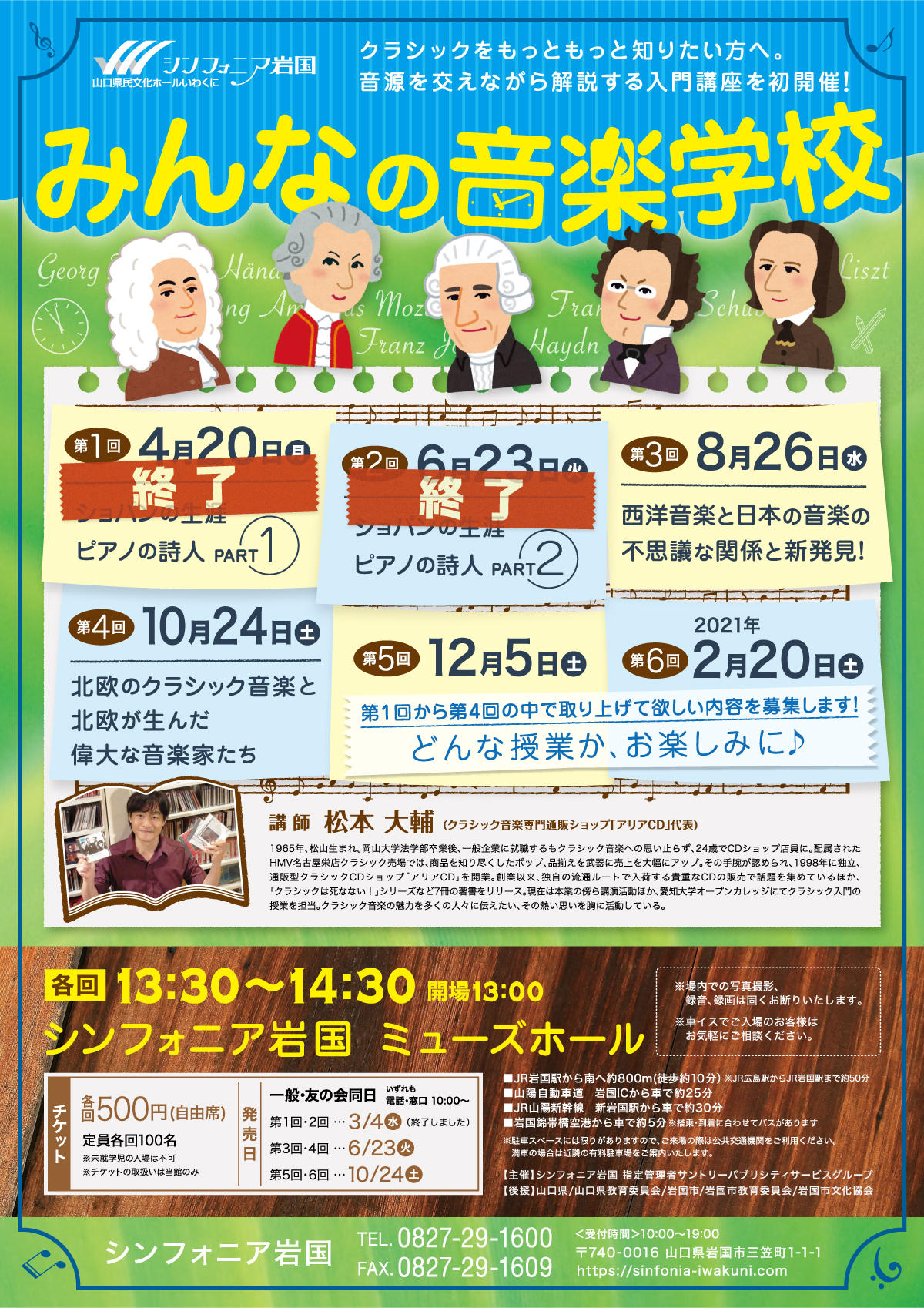| 主催・後援等 | 【主催】岩国市/シンフォニア岩国(山口県民文化ホールいわくに) 【後援】岩国市教育委員会/山口県教育委員会/(公財)岩国市文化芸術振興財団/岩国市文化協会/山口県立岩国工業高等学校同窓会/国際ソロプチミスト岩国 |