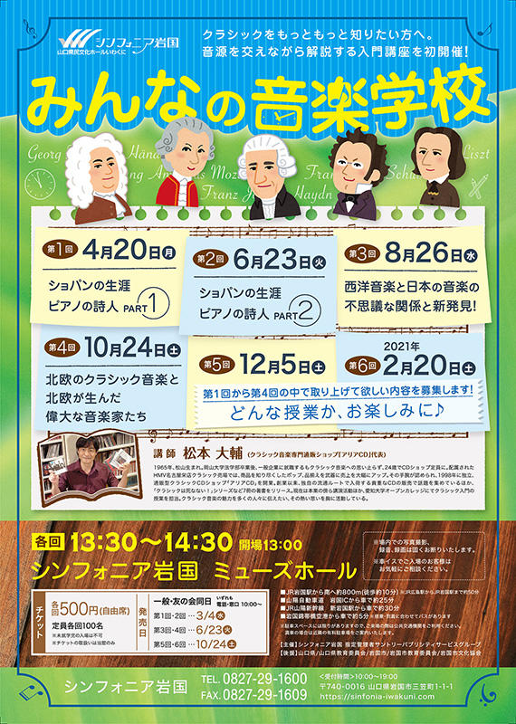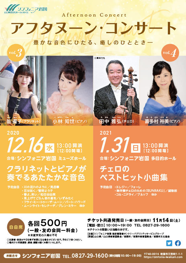 | 主催・後援等 | 【主催】シンフォニア岩国 指定管理者サントリーパブリシティサービスグループ 【後援】山口県/山口県教育委員会/山口県文化連盟/岩国市/岩国市教育委員会/岩国文化協会 |