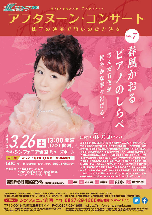 | 主催・後援等 | 【主催】シンフォニア岩国 指定管理者サントリーパブリシティサービスグループ 【後援】山口県/山口県教育委員会/山口県文化連盟/岩国市/岩国市教育委員会/岩国文化協会 |