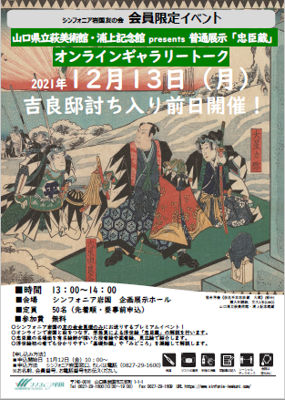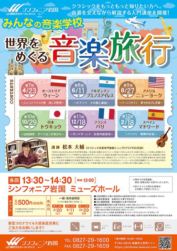 | 主催・後援等 | 【主催】シンフォニア岩国 指定管理者サントリーパブリシティサービスグループ 【後援】山口県/山口県教育委員会/山口県文化連盟/岩国市/岩国市教育委員会/岩国市文化協会 |