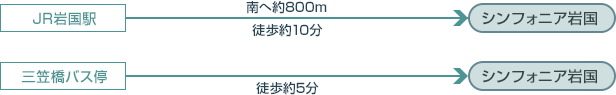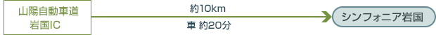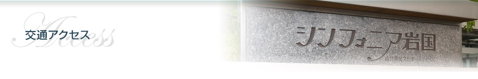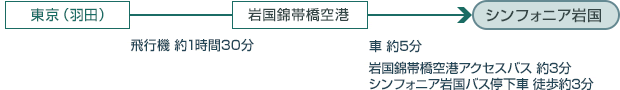 羽田空港から岩国錦帯橋空港まで飛行機で約1時間30分。岩国錦帯橋空港から車で約5分。岩国錦帯橋空港アクセスバスで約3分、シンフォニア岩国バス停下車、徒歩約3分。